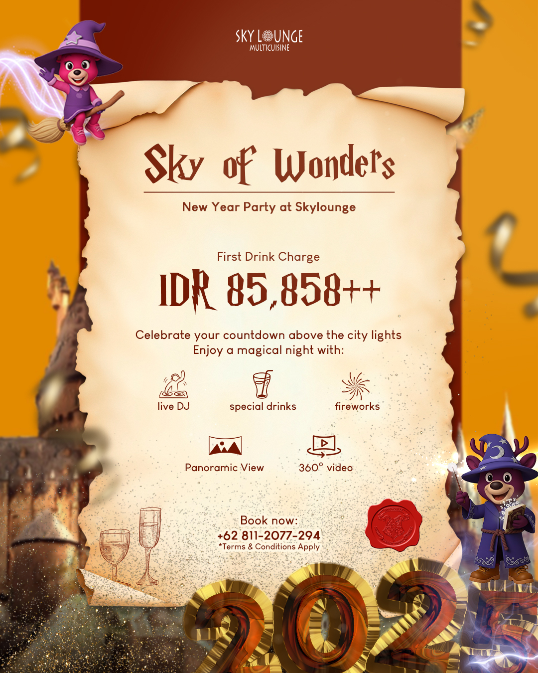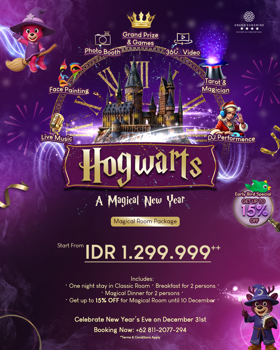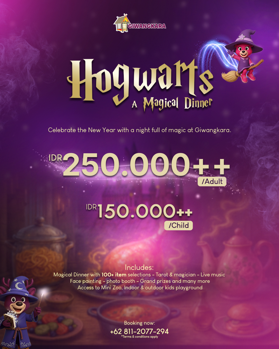 Deliver an immersive New Year’s Eve experience dengan Magical Dinner bertema Hogwarts, menghadirkan 100+ curated dishes untuk keluarga. Aktivasi hiburan mencakup tarot & magician show, live music, face painting, photobooth, kids playground, mini zoo, hingga grand prizes. Create a high-engagement celebration dan amankan reservasi Anda untuk malam penuh warmth & wonder.